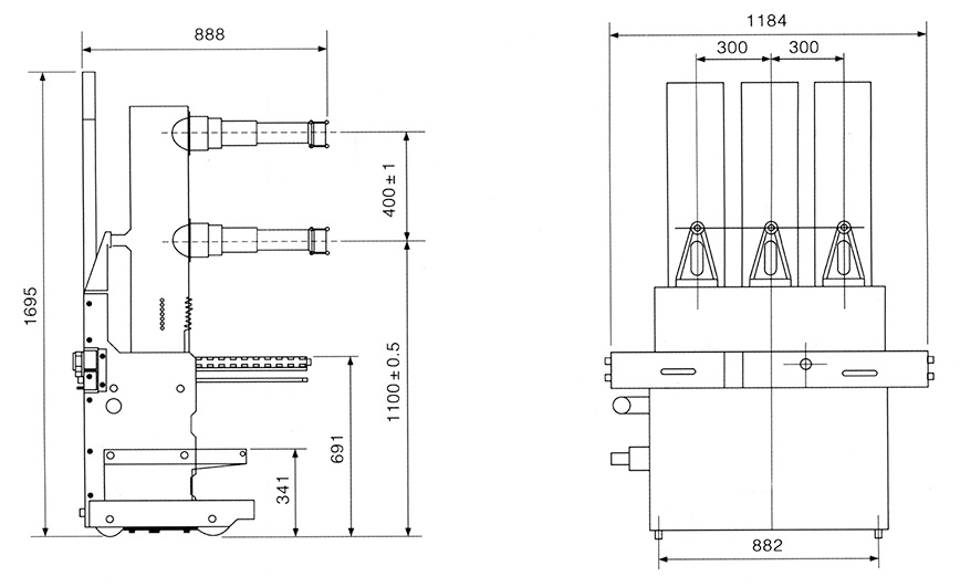 三相滅弧室和相聯帶電體由三只獨立的環氧樹脂絕緣筒相隔離,構成復合絕緣結構,斷路器滿足正常運行條件下的空氣距和爬距要求,并有效地減小了斷路器的體積。主導電回路真空滅弧室和動靜導電聯接安裝在絕緣筒內,使相間距僅為300mm。主回路電氣連接全部采用固定式連接,具有很高的可靠性。絕緣筒安裝在斷路器框架上方。