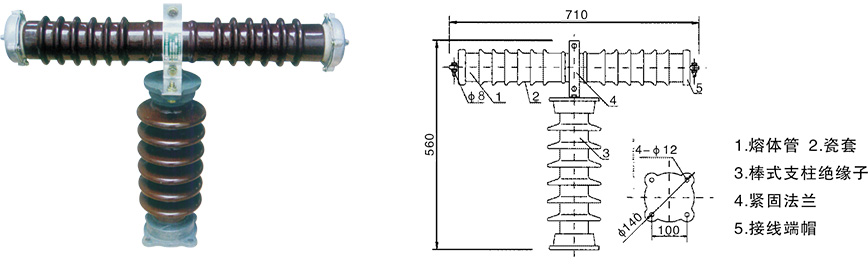 熔斷器由熔體管、瓷套、緊固法蘭、棒形支柱絕緣子和接線端帽等組成。用壓裝的方法將兩端的接線端帽為熔體管固定在瓷套內,然后用緊固法蘭把瓷套固定在棒形支柱絕緣子上,其結構說明和外表尺寸如圖所示。